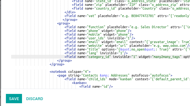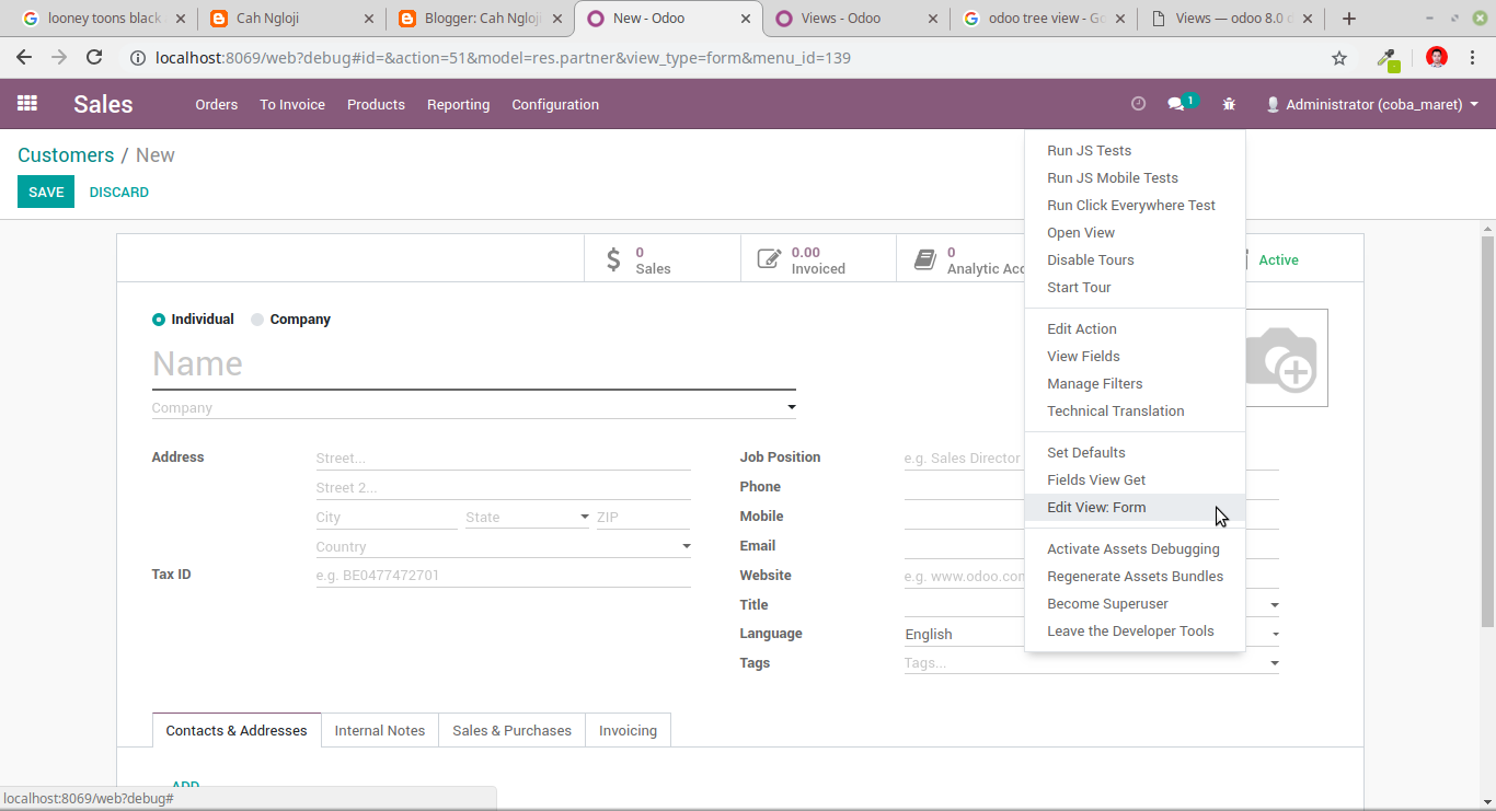 Gunakan cara ini jika tampilan yang ingin anda ubah adalah tampilan default / widget Odoo seperti Form, Tree, Search, Action dll. Misal pada form Customer anda ingin menyembunyikan field Language dan tags. Ikuti langkah berikut.
