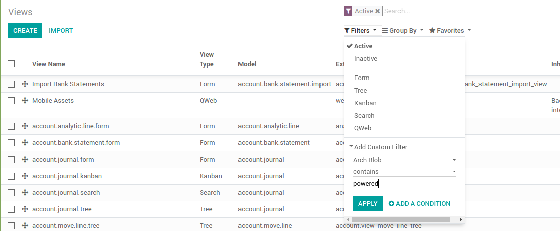 Kode tampilan / view pada Odoo disimpan dalam database. Tidak disimpan dalam file. Memang jika kita membuat custom module, kode kita tulis dalam file seperti umumnya pemrograman web. Tetapi jika kita install module tersebut, kode yang kita tulis akan dimasukkan ke database, lebih tepatnya ke table ir_ui_view. Dan dari table tersebutlah kode view diambil dan dikirim ke browser untuk dirender. Bukan dari file module kita