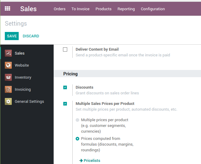 Masuk menu Sales >> Configuration >> Setting. Centang pada bagian Discount dan Multiple Sales Price per Product