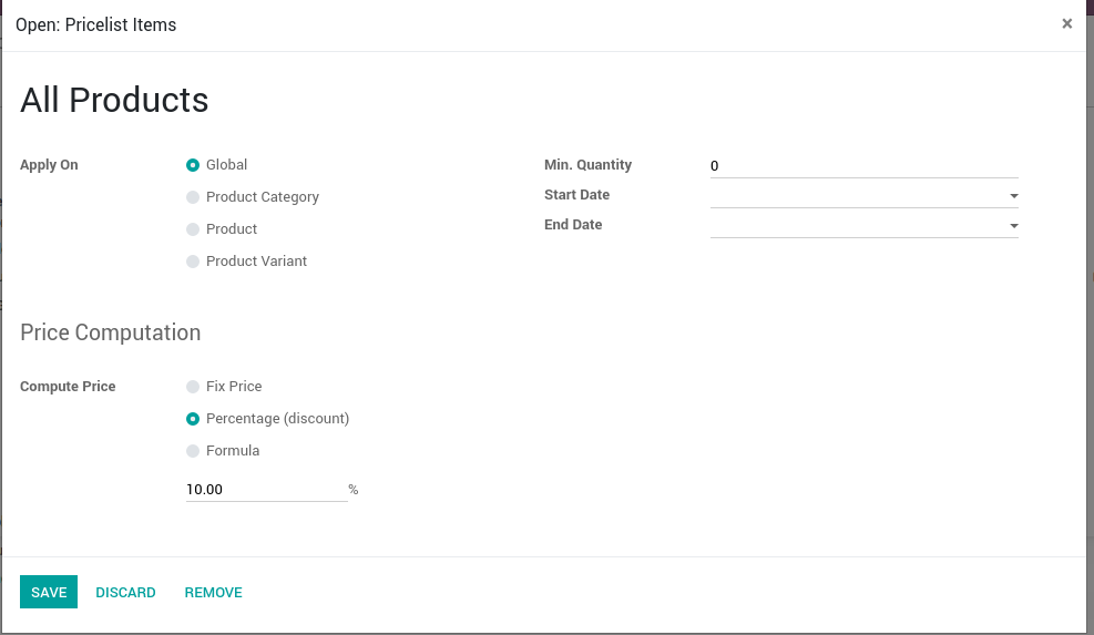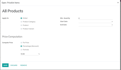 Masukkan diskon yang anda inginkan dibagian Pricelist Item. Misal pada gambar dibawah saya memberikan diskon 10% untuk semua produk tanpa batas minimal pembelian dan tanpa batas waktu. Silakan anda pilih jenis diskon sesuai toko online anda.